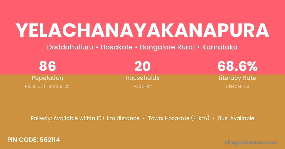Hosakote (4 km) is the nearest town to Yelachanayakanapura village for major economic activities and is located approximately 4 km away.