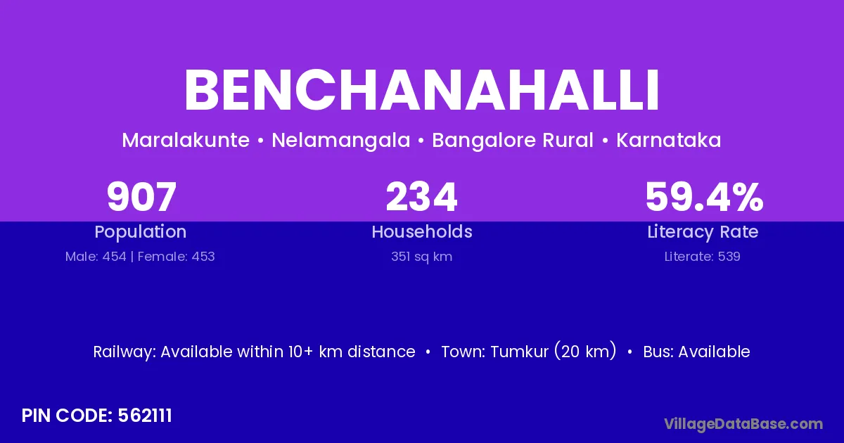 Benchanahalli village has a total population of 907 people, of which 454 are males and 453 are females.