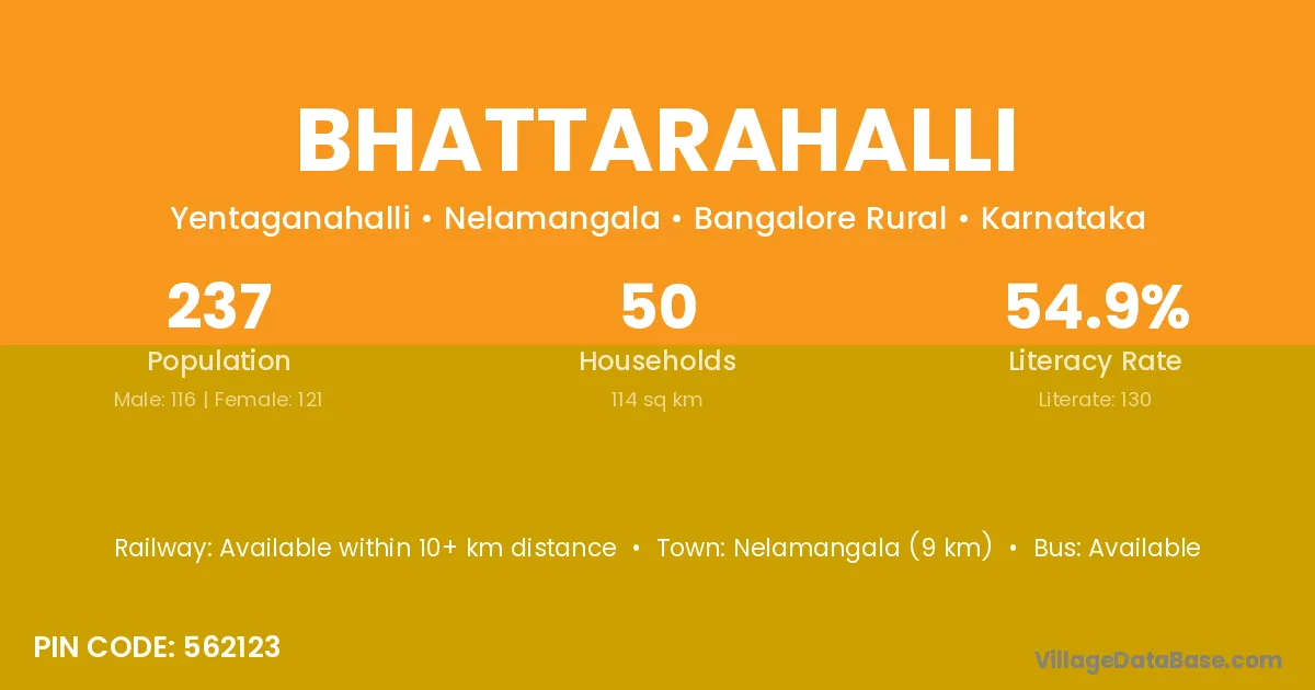 Bhattarahalli village has a total population of 237 people, of which 116 are males and 121 are females.
