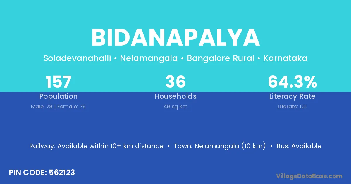 Bidanapalya village has a total population of 157 people, of which 78 are males and 79 are females.
