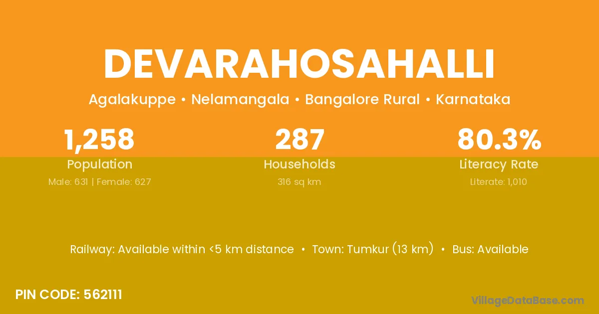 Devarahosahalli village has a total population of 1,258 people, of which 631 are males and 627 are females.