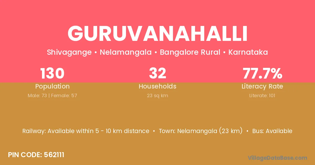 Nelamangala (23 km) is the nearest town to Guruvanahalli village for major economic activities and is located approximately 23 km away.