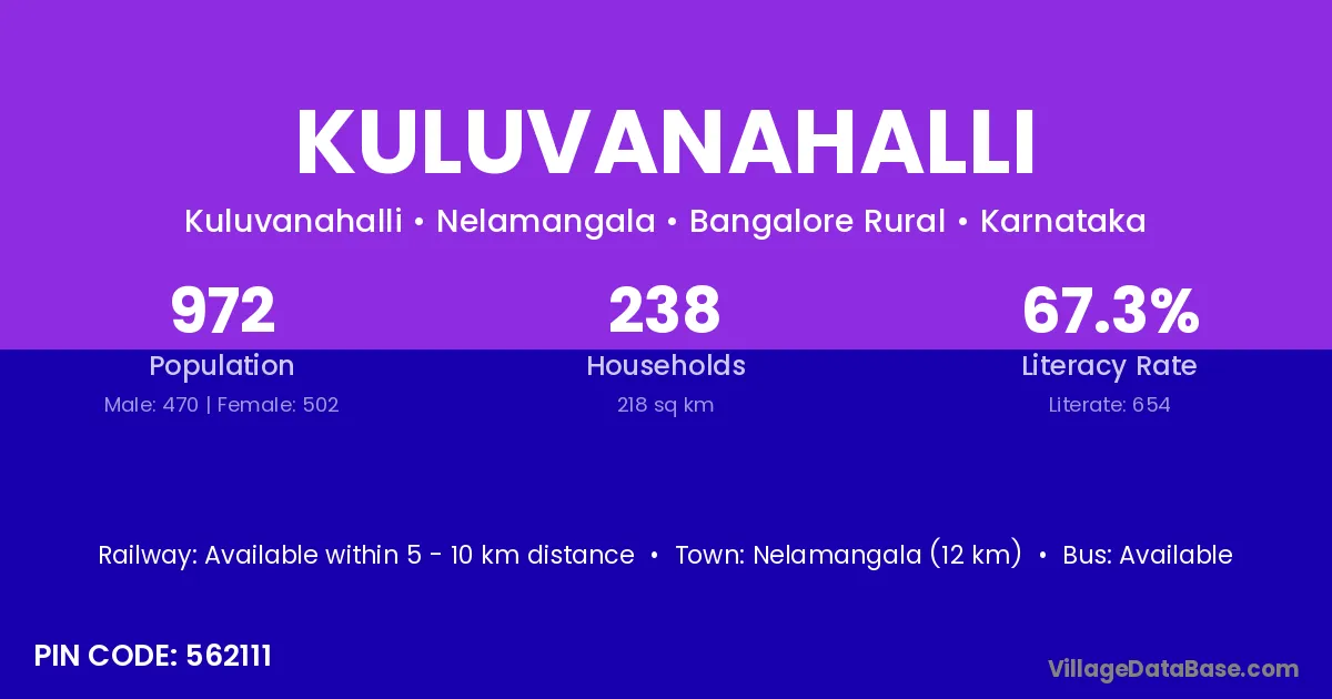 Nelamangala (12 km) is the nearest town to Kuluvanahalli village for major economic activities and is located approximately 12 km away.