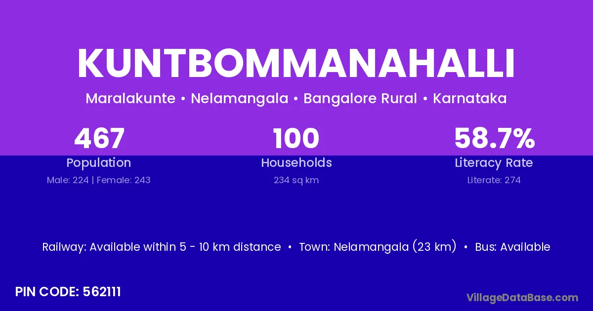 Nelamangala (23 km) is the nearest town to Kuntbommanahalli village for major economic activities and is located approximately 23 km away.