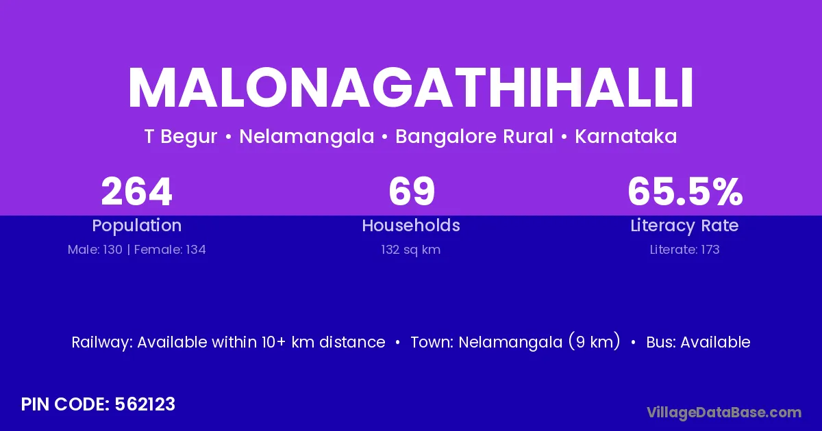 Nelamangala (9 km) is the nearest town to Malonagathihalli village for major economic activities and is located approximately 9 km away.