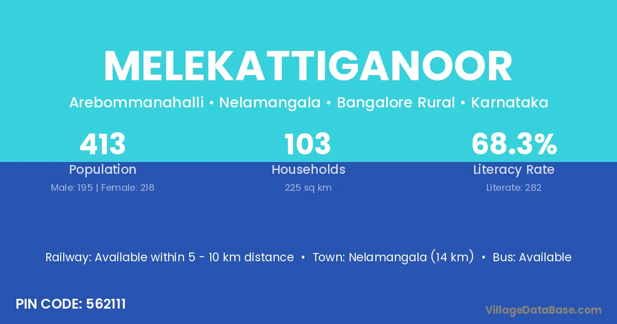 Nelamangala (14 km) is the nearest town to Melekattiganoor village for major economic activities and is located approximately 14 km away.