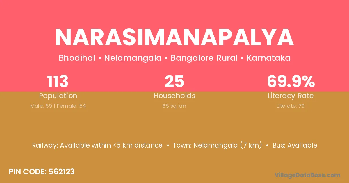 Nelamangala (7 km) is the nearest town to Narasimanapalya village for major economic activities and is located approximately 7 km away.