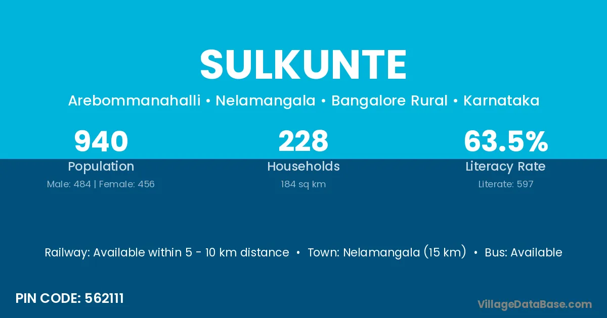 Nelamangala (15 km) is the nearest town to Sulkunte village for major economic activities and is located approximately 15 km away.