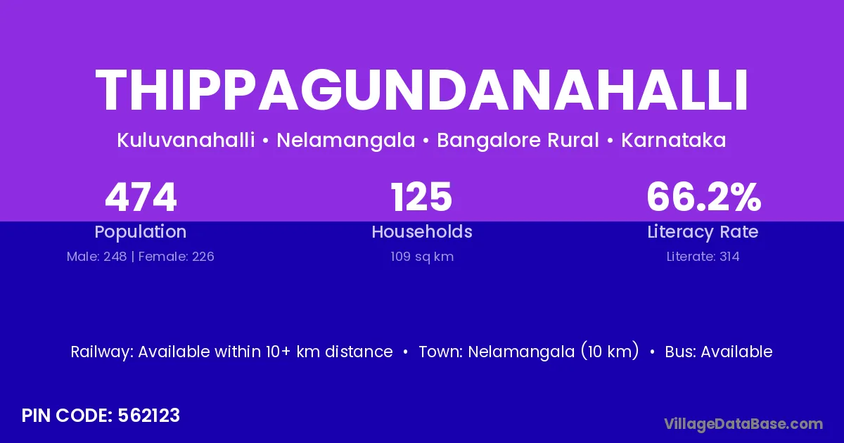 Thippagundanahalli village has a total population of 474 people, of which 248 are males and 226 are females.