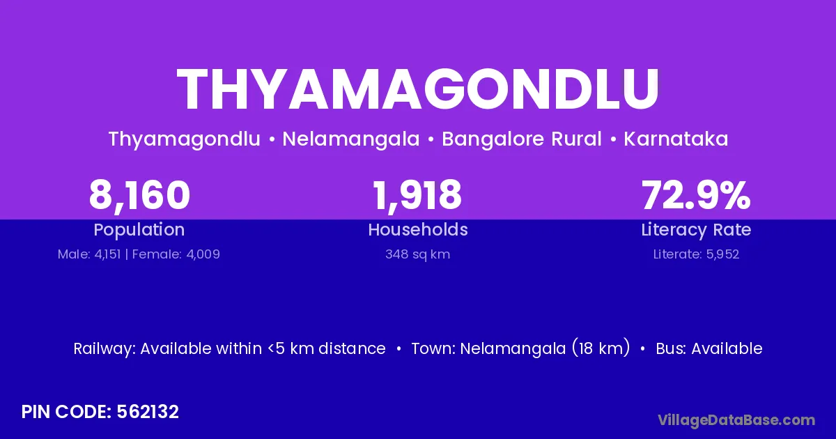 Nelamangala (18 km) is the nearest town to Thyamagondlu village for major economic activities and is located approximately 18 km away.