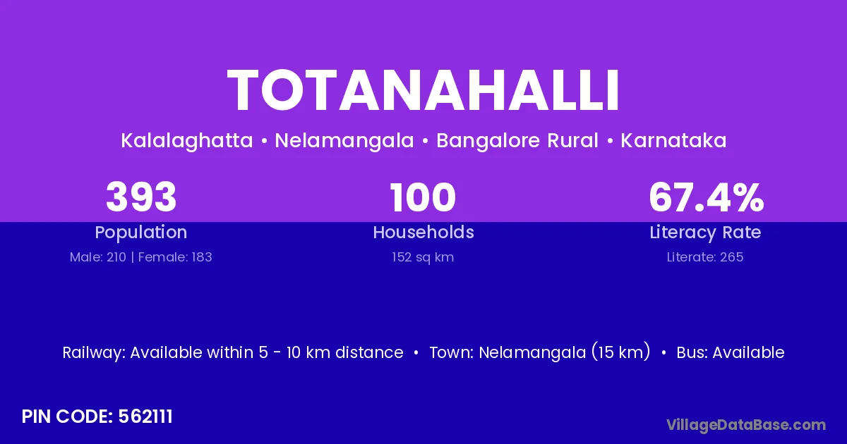 Nelamangala (15 km) is the nearest town to Totanahalli village for major economic activities and is located approximately 15 km away.