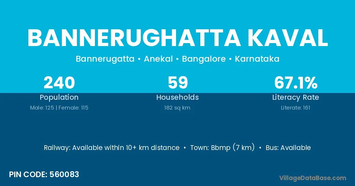Bbmp (7 km) is the nearest town to Bannerughatta Kaval village for major economic activities and is located approximately 7 km away.