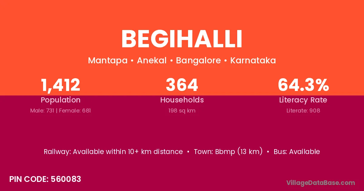 Bbmp (13 km) is the nearest town to Begihalli village for major economic activities and is located approximately 13 km away.