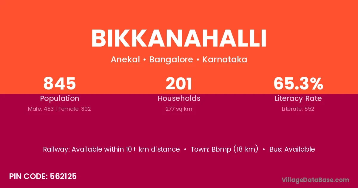 Bikkanahalli village has a total population of 845 people, of which 453 are males and 392 are females.