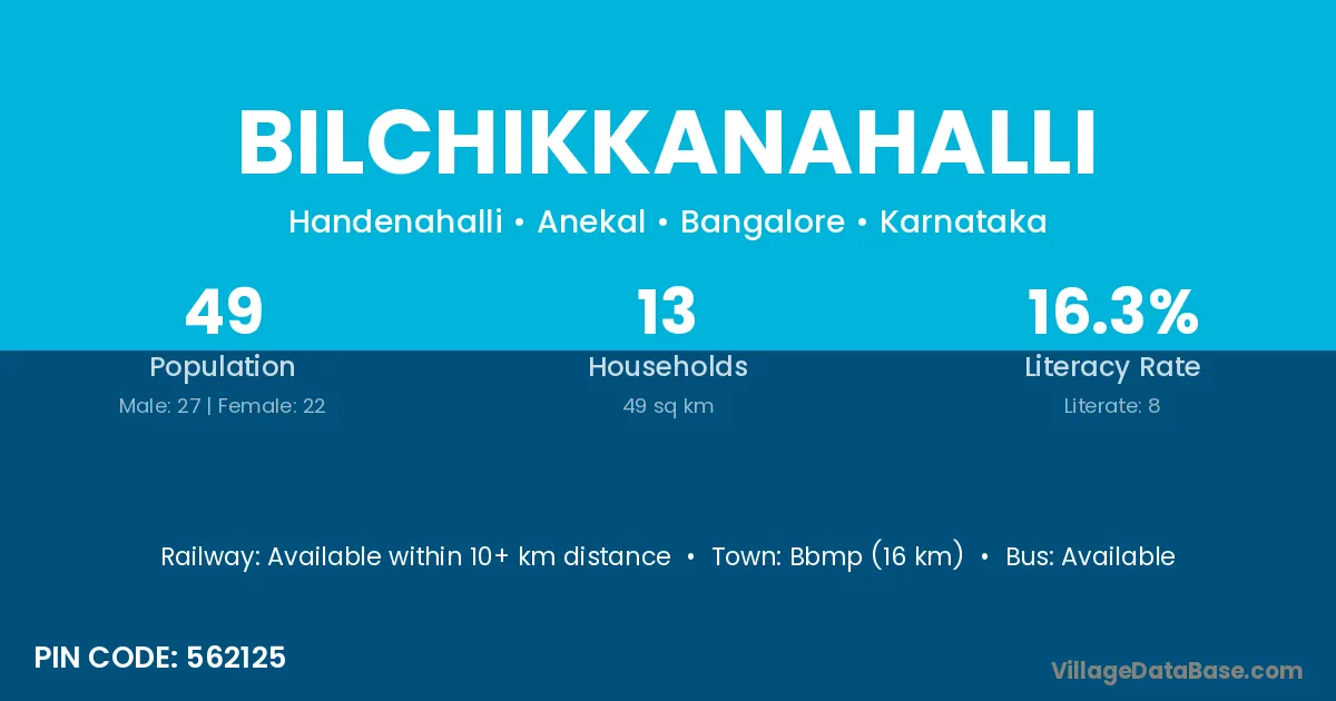 Bbmp (16 km) is the nearest town to Bilchikkanahalli village for major economic activities and is located approximately 16 km away.