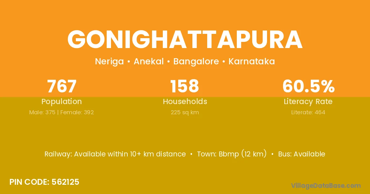 Bbmp (12 km) is the nearest town to Gonighattapura village for major economic activities and is located approximately 12 km away.