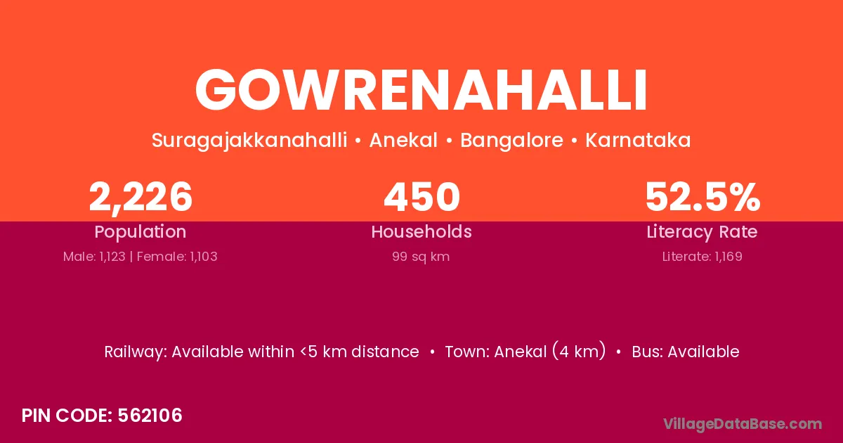 Anekal (4 km) is the nearest town to Gowrenahalli village for major economic activities and is located approximately 4 km away.