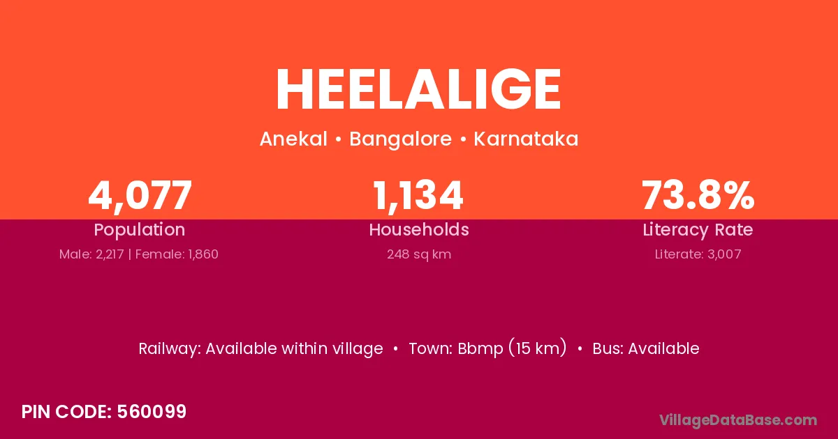 According to Census 2011 information, the village code of Heelalige village is 560099.