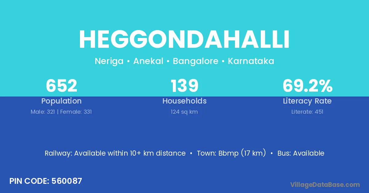 Bbmp (17 km) is the nearest town to Heggondahalli village for major economic activities and is located approximately 17 km away.