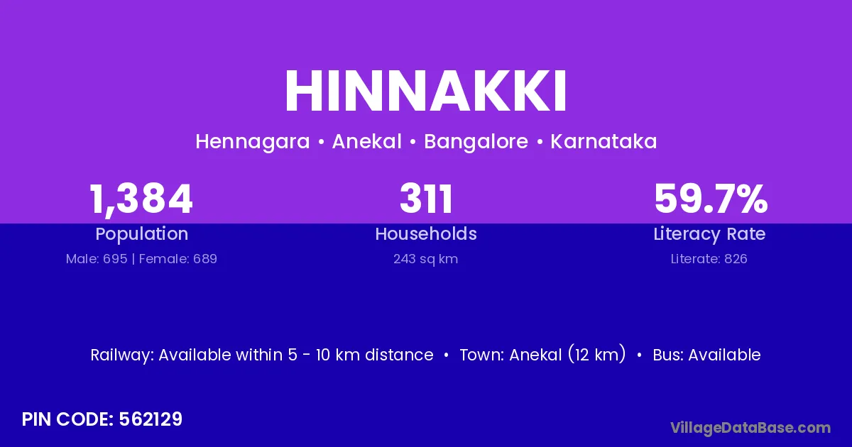 Anekal (12 km) is the nearest town to Hinnakki village for major economic activities and is located approximately 12 km away.