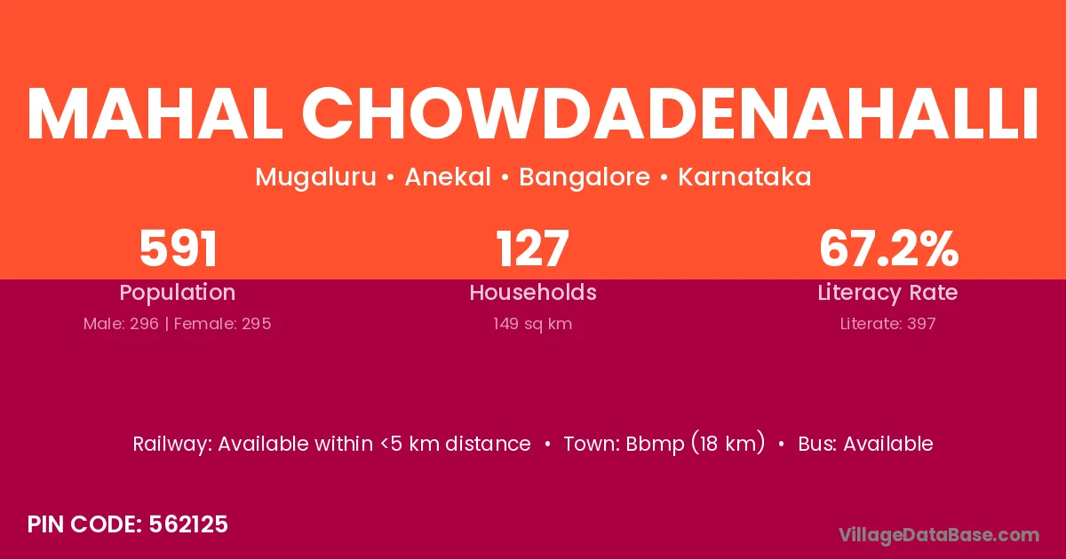 Mahal Chowdadenahalli village has a total population of 591 people, of which 296 are males and 295 are females.