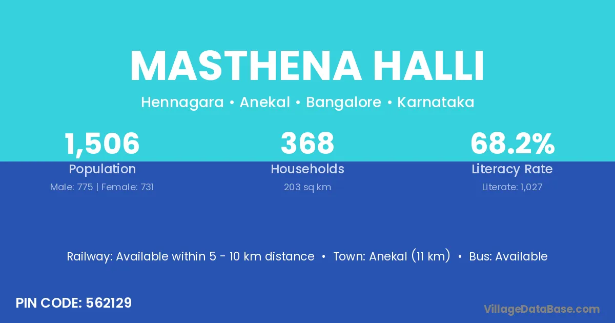 Anekal (11 km) is the nearest town to Masthena Halli village for major economic activities and is located approximately 11 km away.