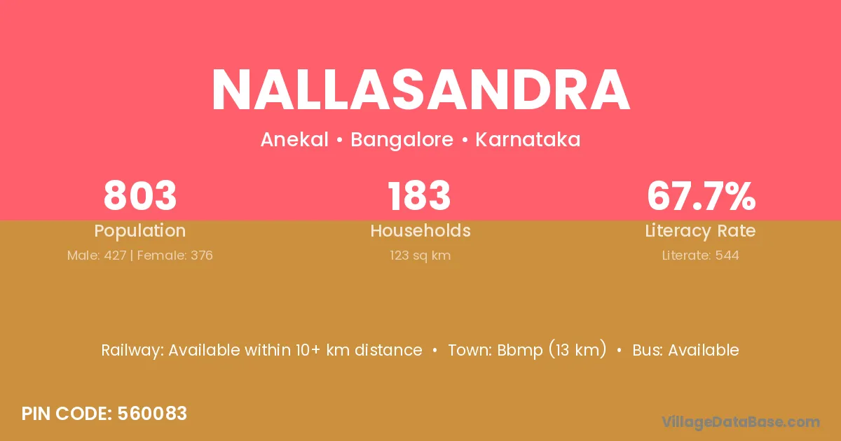 Bbmp (13 km) is the nearest town to Nallasandra village for major economic activities and is located approximately 13 km away.
