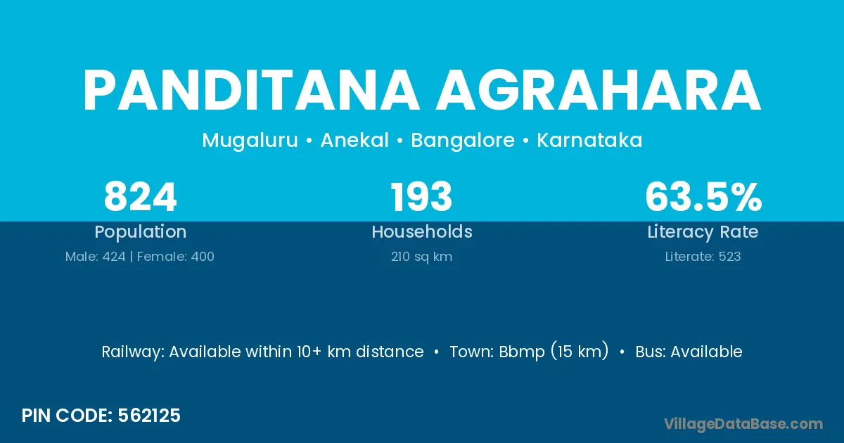 Panditana Agrahara village has a total population of 824 people, of which 424 are males and 400 are females.