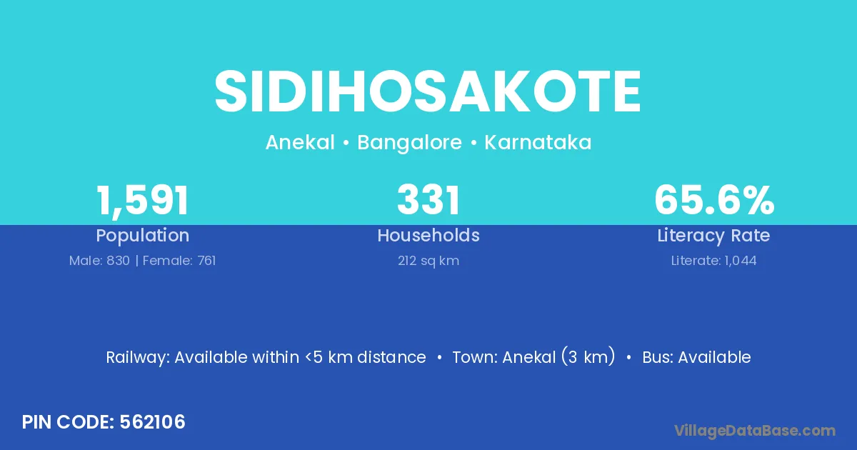 Anekal (3 km) is the nearest town to Sidihosakote village for major economic activities and is located approximately 3 km away.