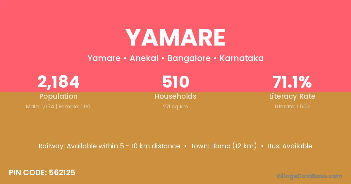 Bbmp (12 km) is the nearest town to Yamare village for major economic activities and is located approximately 12 km away.