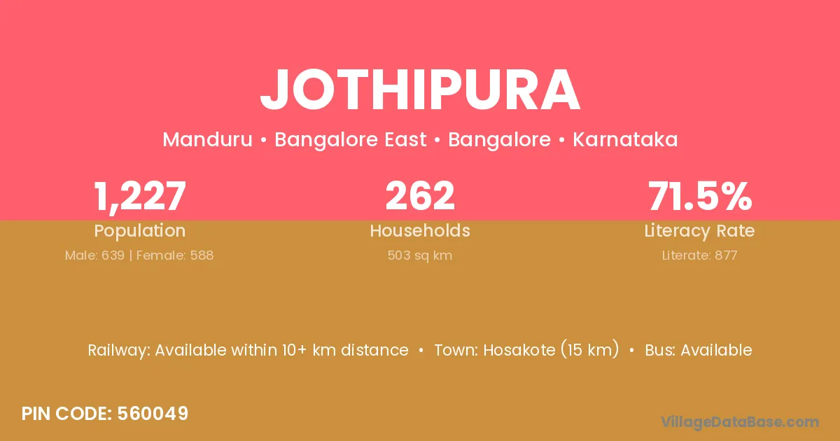 Hosakote (15 km) is the nearest town to Jothipura village for major economic activities and is located approximately 15 km away.