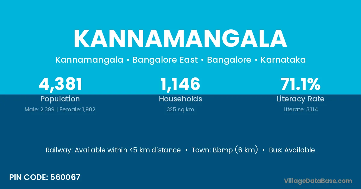 Bbmp (6 km) is the nearest town to Kannamangala village for major economic activities and is located approximately 6 km away.