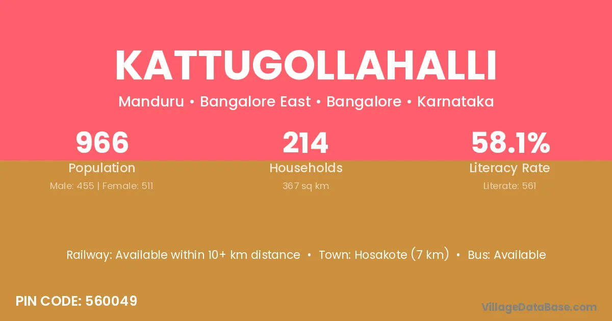 Kattugollahalli village has a total population of 966 people, of which 455 are males and 511 are females.