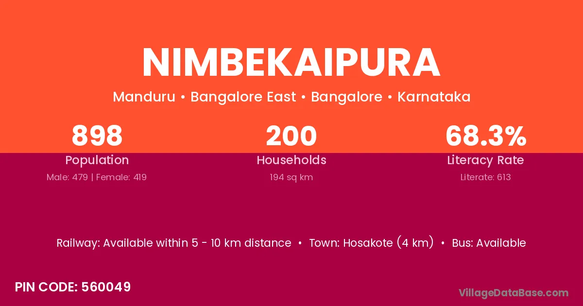 Hosakote (4 km) is the nearest town to Nimbekaipura village for major economic activities and is located approximately 4 km away.