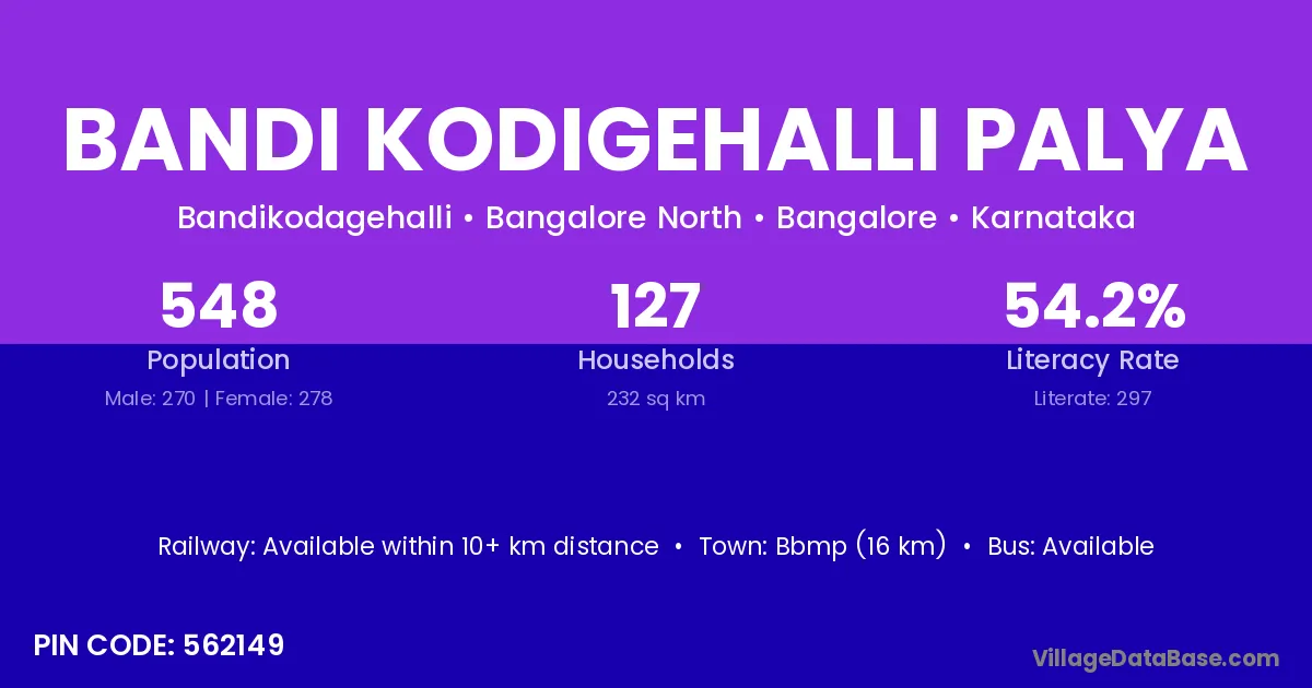 Bandi Kodigehalli Palya village has a total population of 548 people, of which 270 are males and 278 are females.