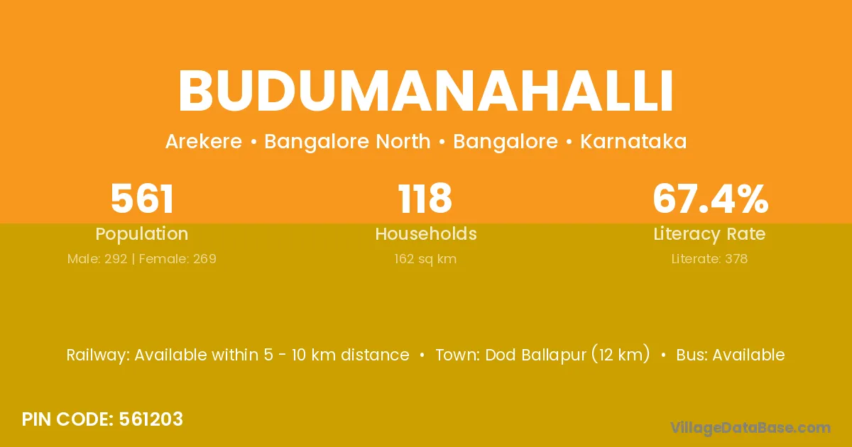 Dod Ballapur (12 km) is the nearest town to Budumanahalli village for major economic activities and is located approximately 12 km away.