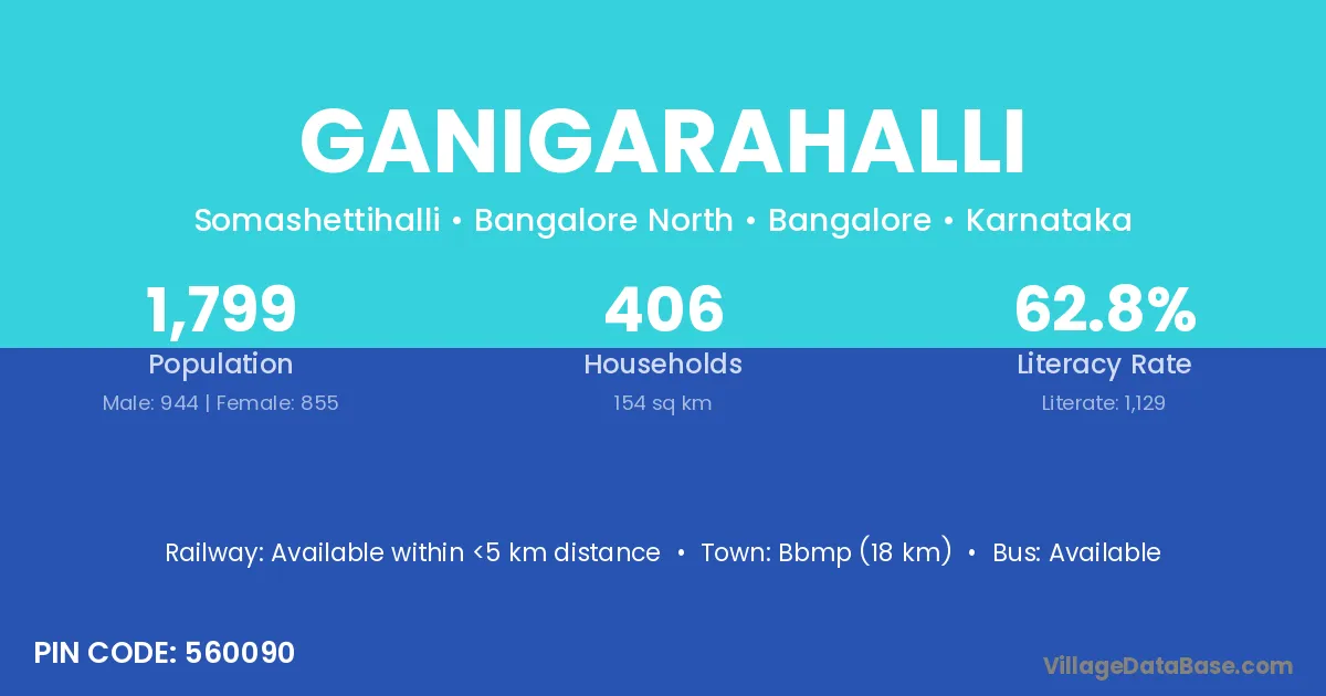 Bbmp (18 km) is the nearest town to Ganigarahalli village for major economic activities and is located approximately 18 km away.