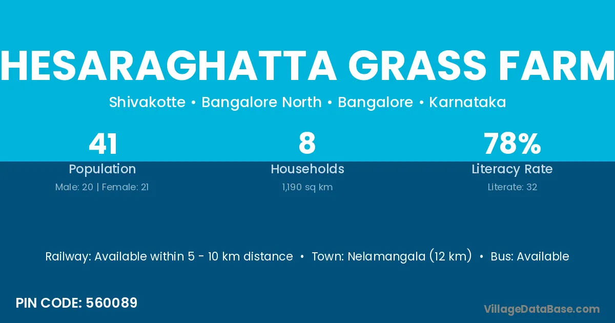 Hesaraghatta Grass Farm village has a total population of 41 people, of which 20 are males and 21 are females.