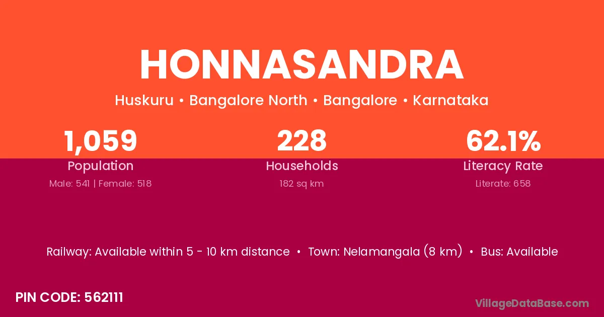 Honnasandra village has a total population of 1,059 people, of which 541 are males and 518 are females.