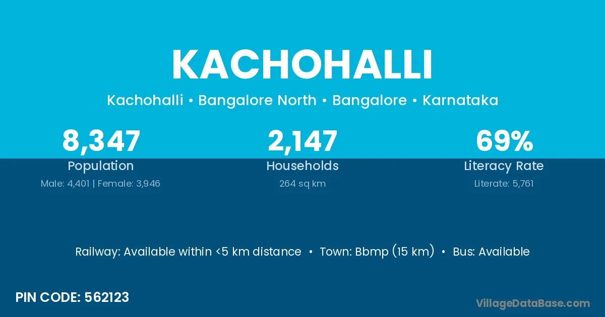 Bbmp (15 km) is the nearest town to Kachohalli village for major economic activities and is located approximately 15 km away.