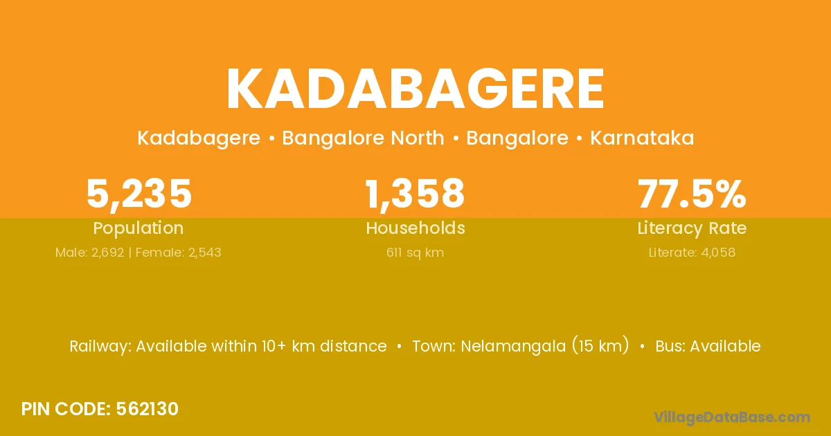 Kadabagere village has a total population of 5,235 people, of which 2,692 are males and 2,543 are females.