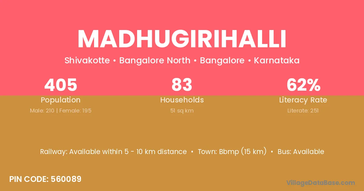 Bbmp (15 km) is the nearest town to Madhugirihalli village for major economic activities and is located approximately 15 km away.