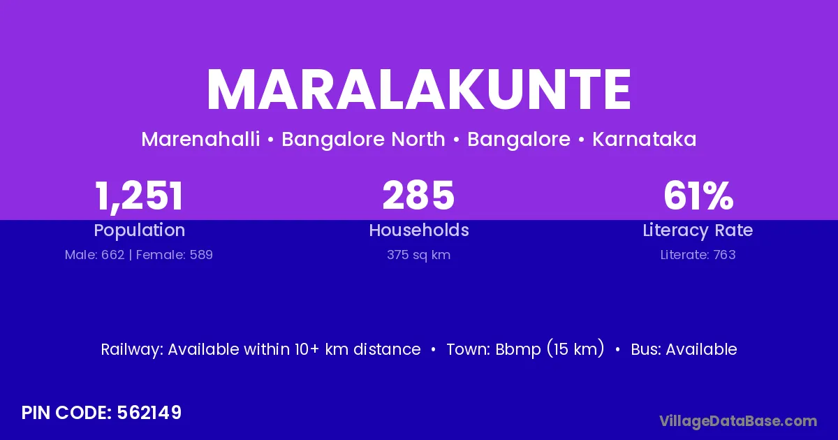 Bbmp (15 km) is the nearest town to Maralakunte village for major economic activities and is located approximately 15 km away.