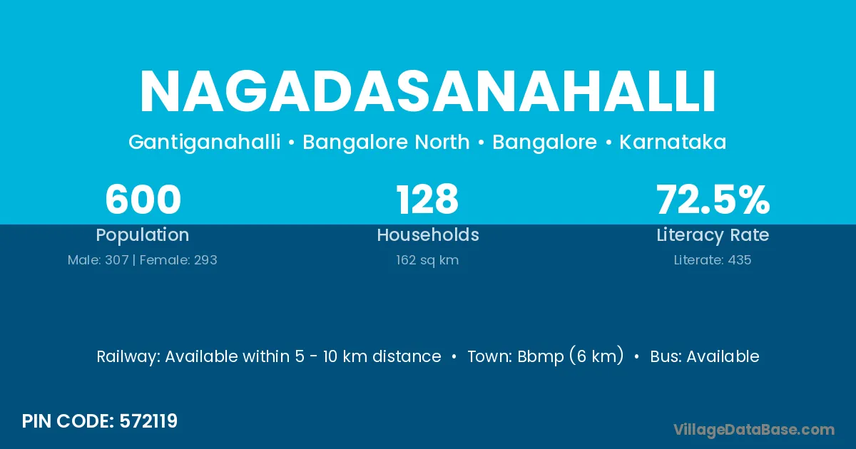 Bbmp (6 km) is the nearest town to Nagadasanahalli village for major economic activities and is located approximately 6 km away.