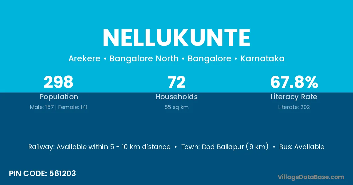 Dod Ballapur (9 km) is the nearest town to Nellukunte village for major economic activities and is located approximately 9 km away.