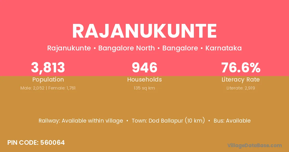 Dod Ballapur (10 km) is the nearest town to Rajanukunte village for major economic activities and is located approximately 10 km away.
