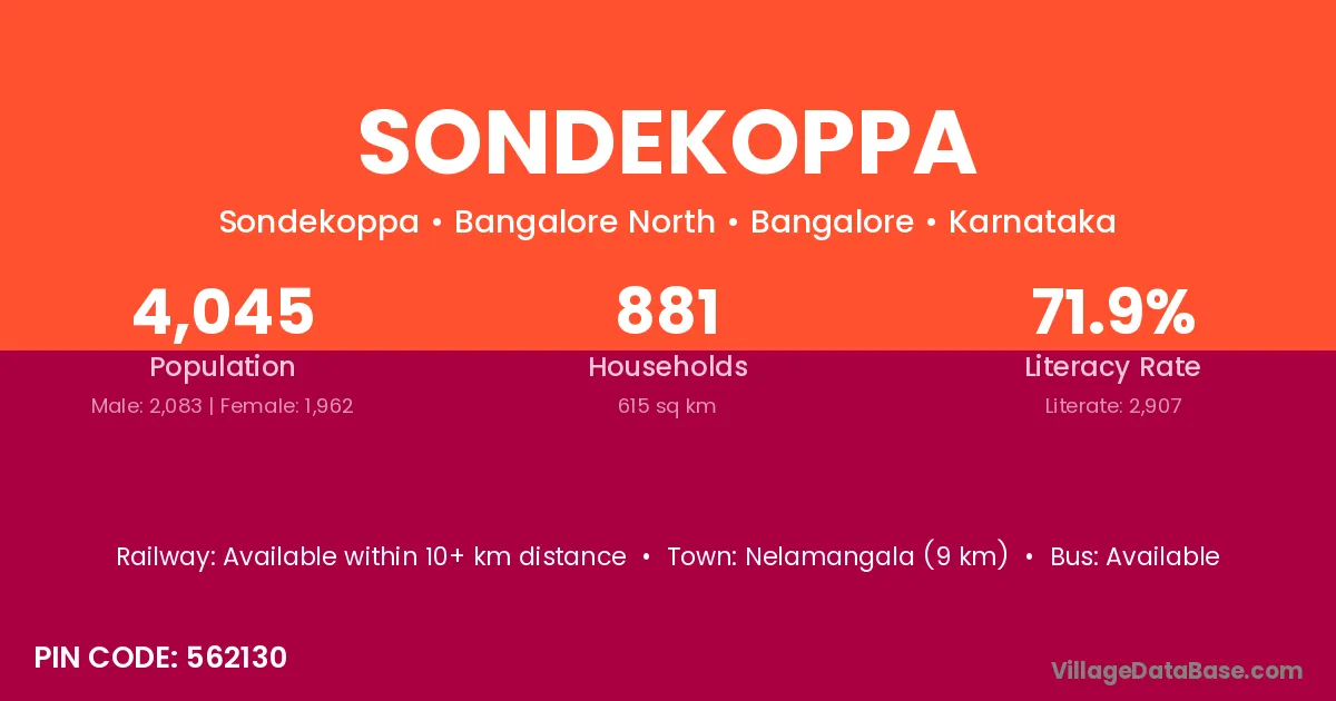 Nelamangala (9 km) is the nearest town to Sondekoppa village for major economic activities and is located approximately 9 km away.