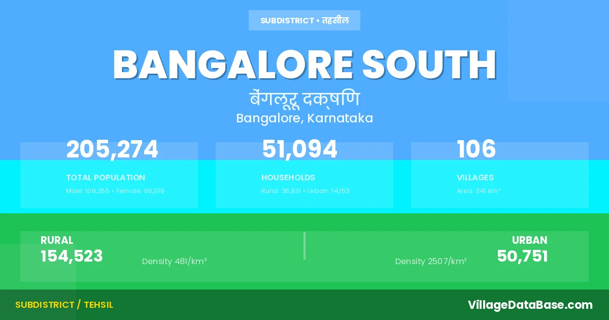 According to the 2011 census The total area of Bangalore South Taluka is 341 km², with a population of 205274 people. The population density is 601 inhabitants per square kilometre, and there are approximately 51094 houses in the sub district.