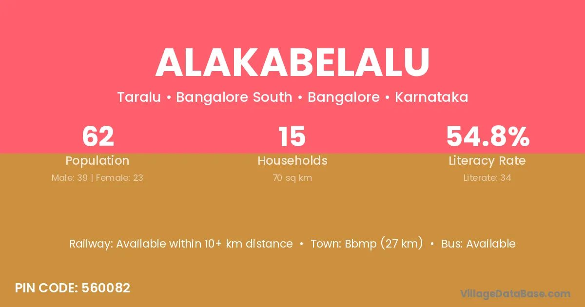 Bbmp (27 km) is the nearest town to Alakabelalu village for major economic activities and is located approximately 27 km away.