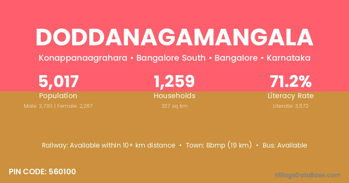 Bbmp (19 km) is the nearest town to Doddanagamangala village for major economic activities and is located approximately 19 km away.